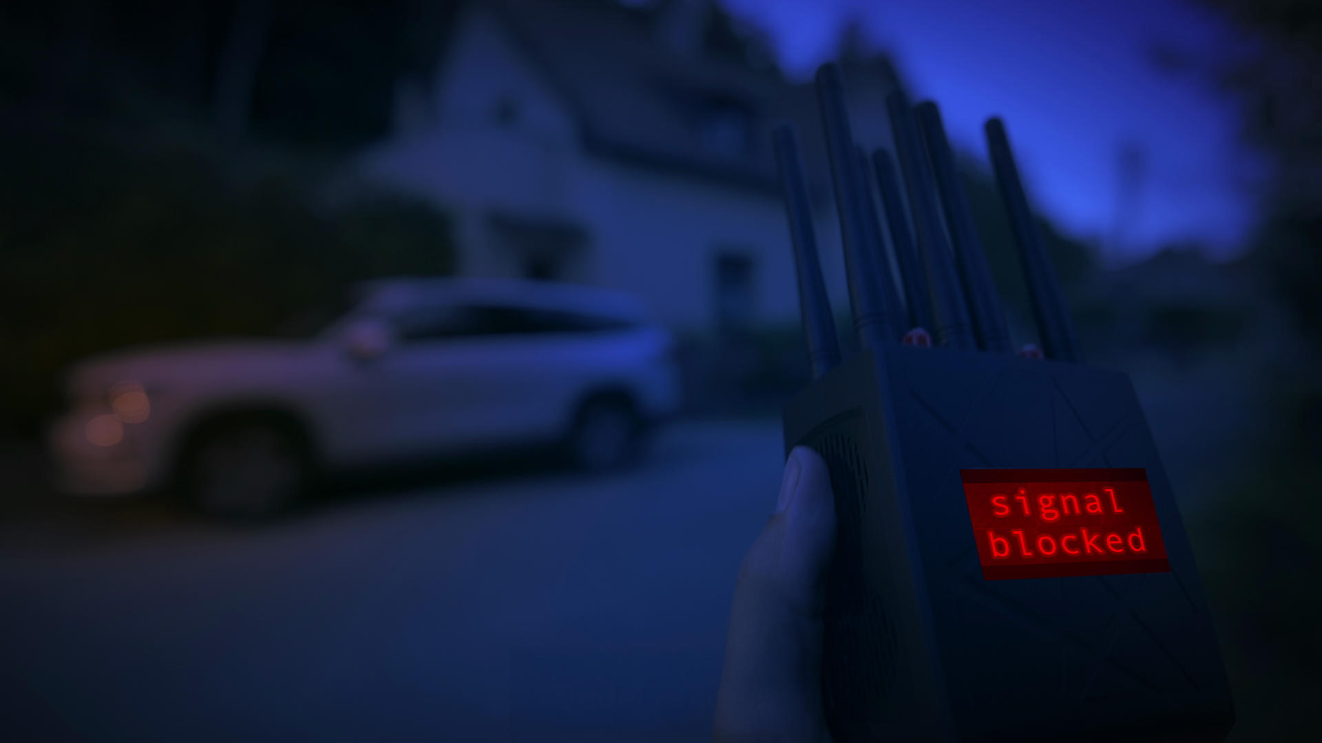 Dvojice zlodějů: jeden u domu s amplifikátorem signálu, druhý u auta